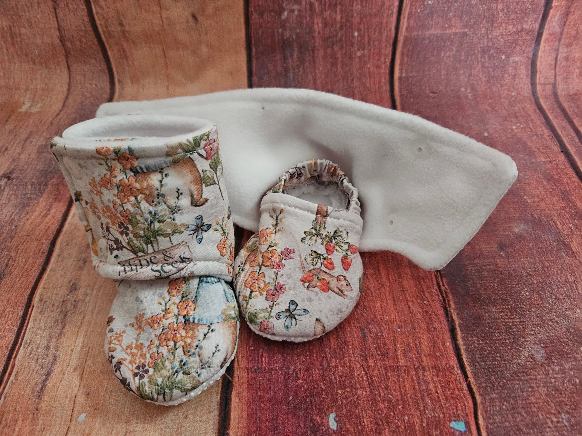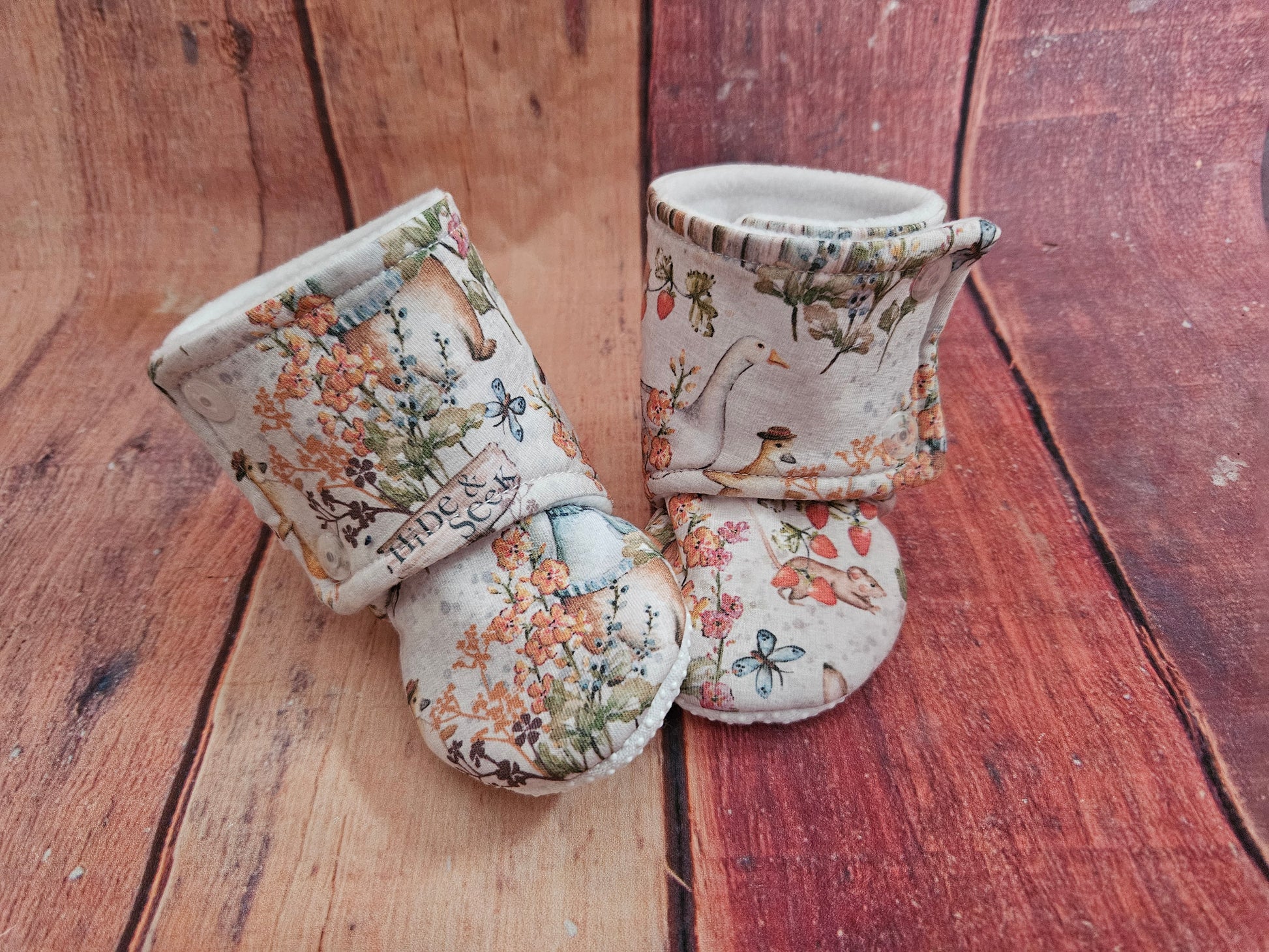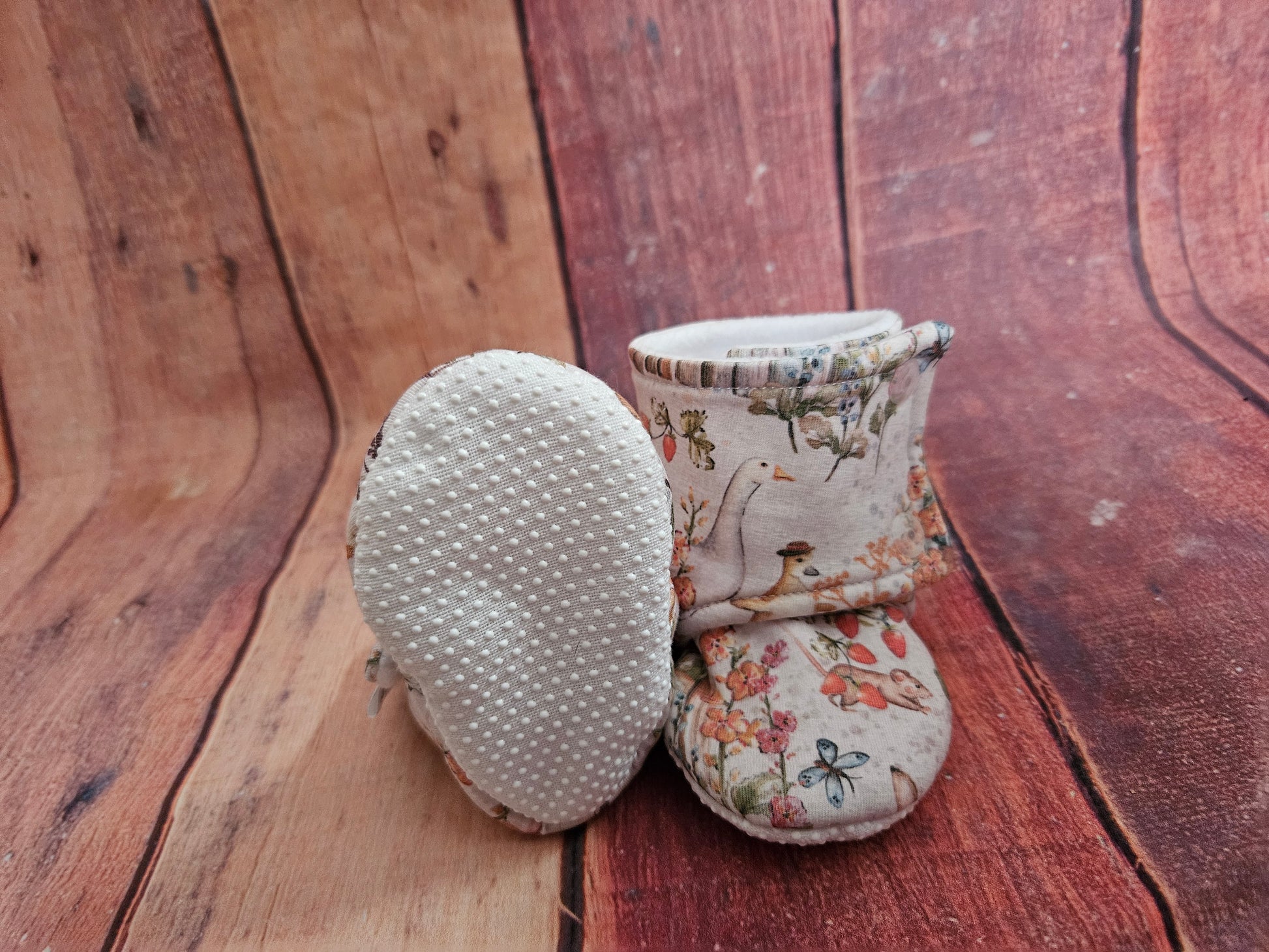 Unisex booties in 6-12 months in a Cottage bunny fabric outter lined with fleece and a non slip sole for those walkers and prewalkers