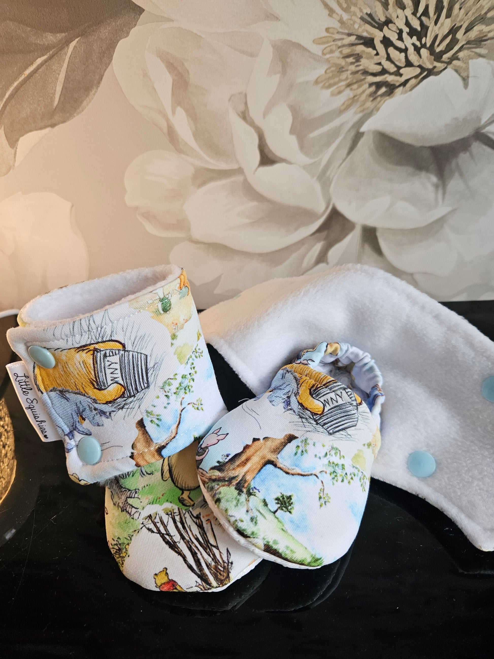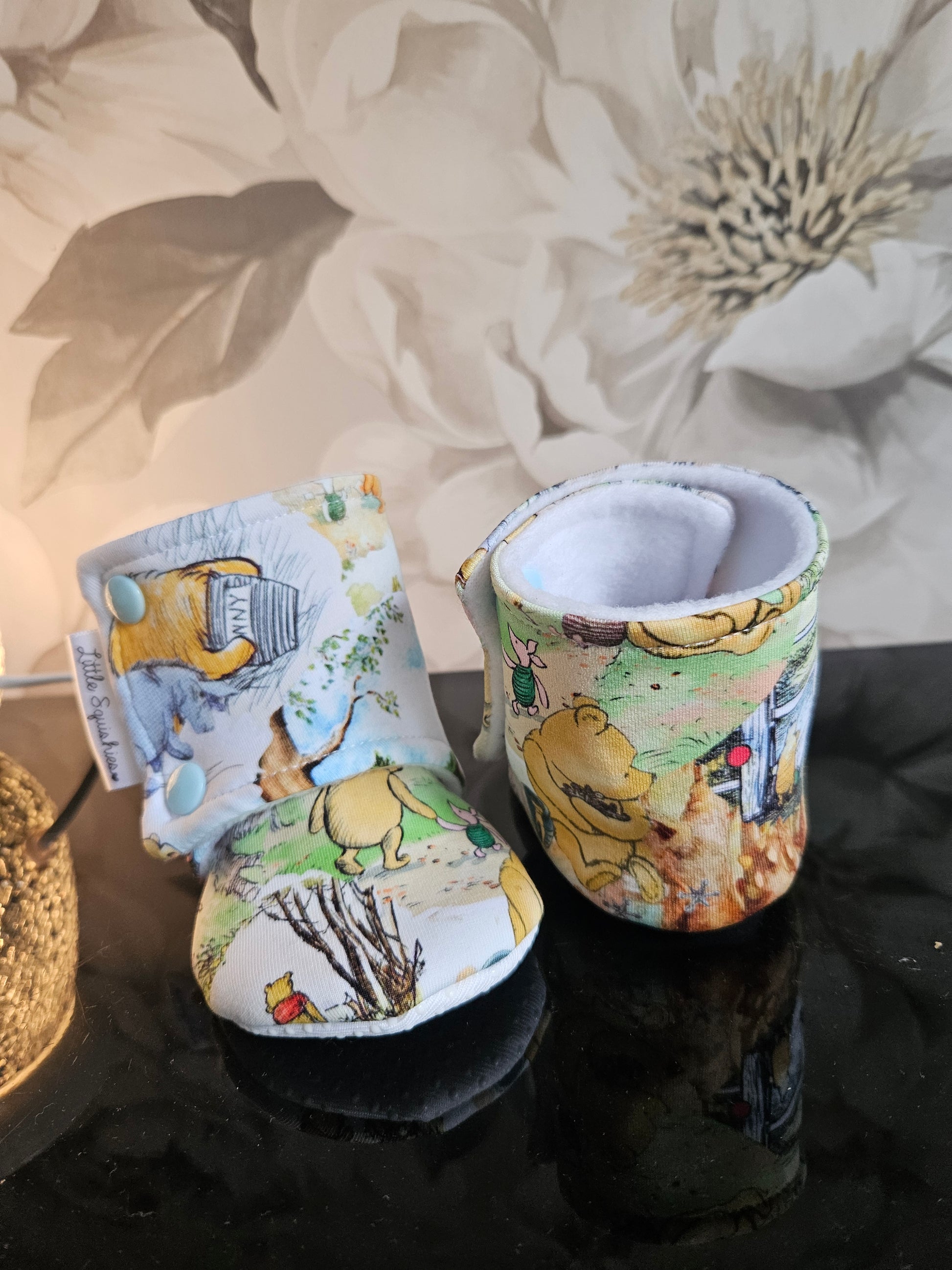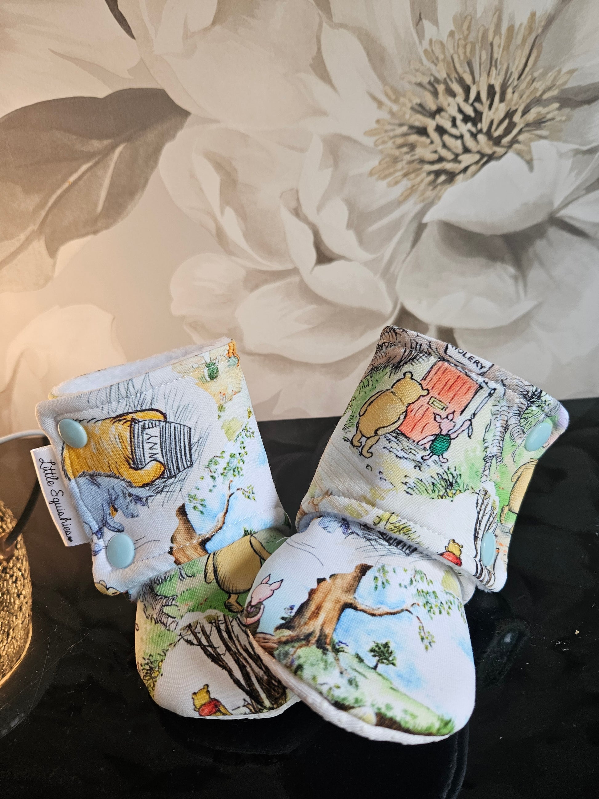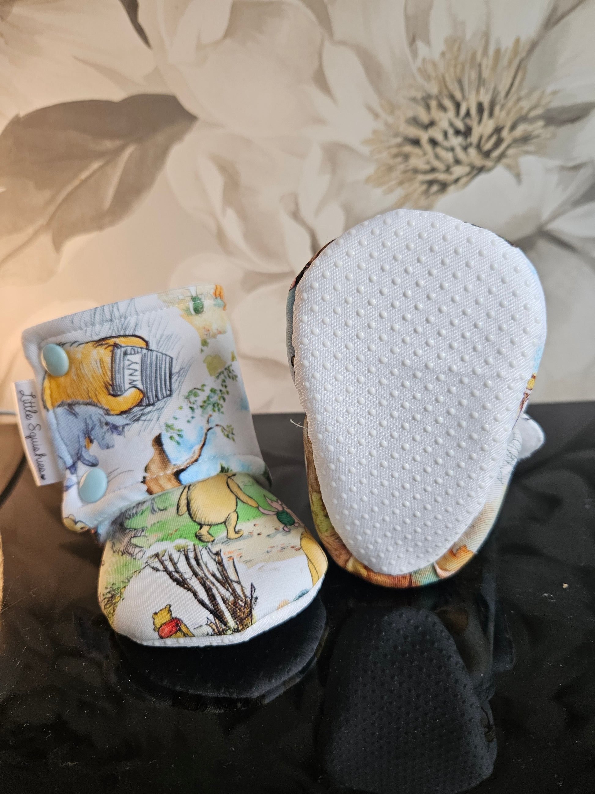 Stay on booties in a range of sizes from 0-6 months to 18-24 months in a super cute unisex winnie the pooh fabric . These booties have non slip soles from size 6-12 months and up . A fleece lining and an elasticated ankle cuff to stop them from being kicked off easily .
